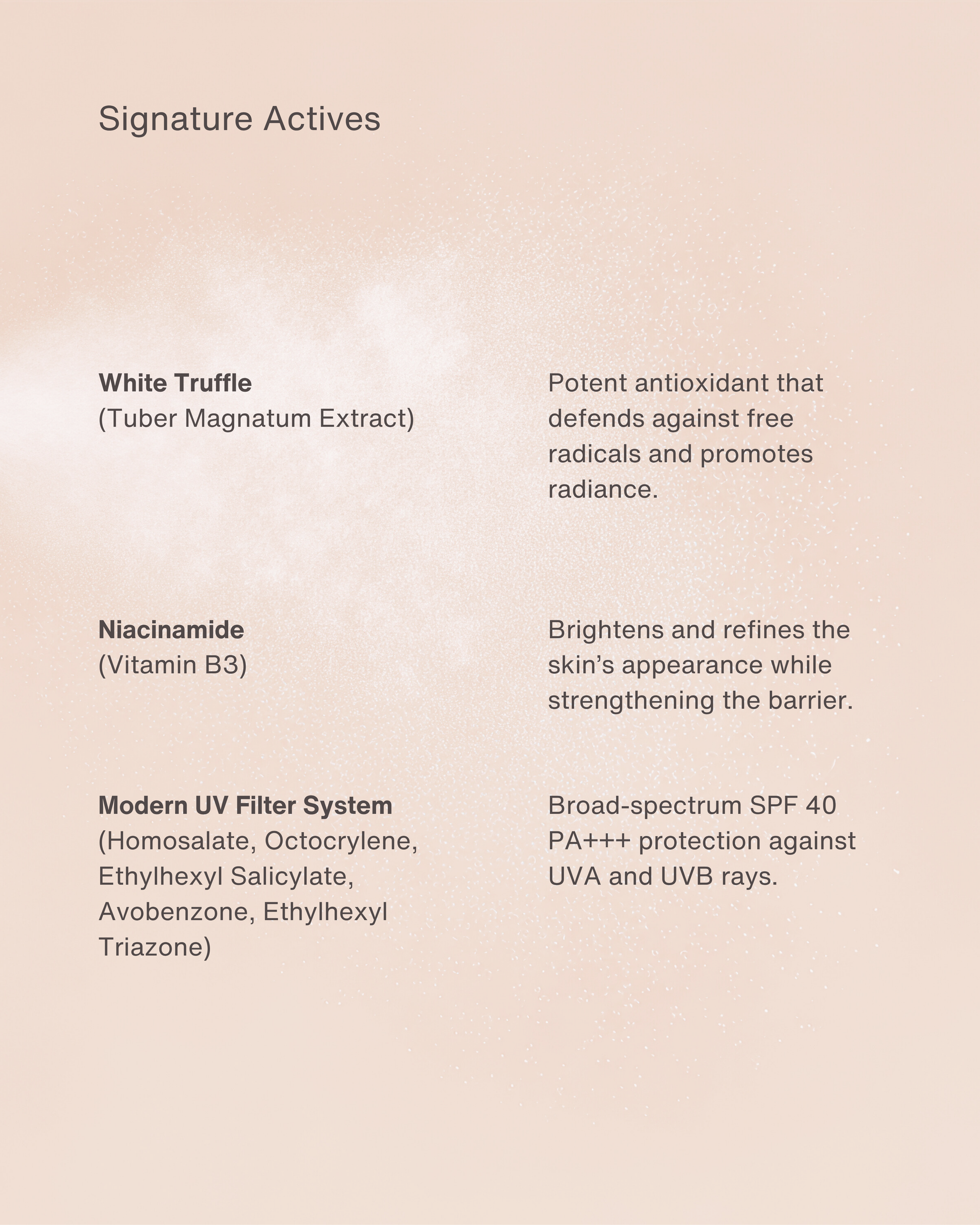 A luxurious antioxidant, white truffle works to neutralize free radicals, boost skin vitality, and support repair from sun-induced stress. It enhances the skin’s natural glow and promotes long-term radiance.