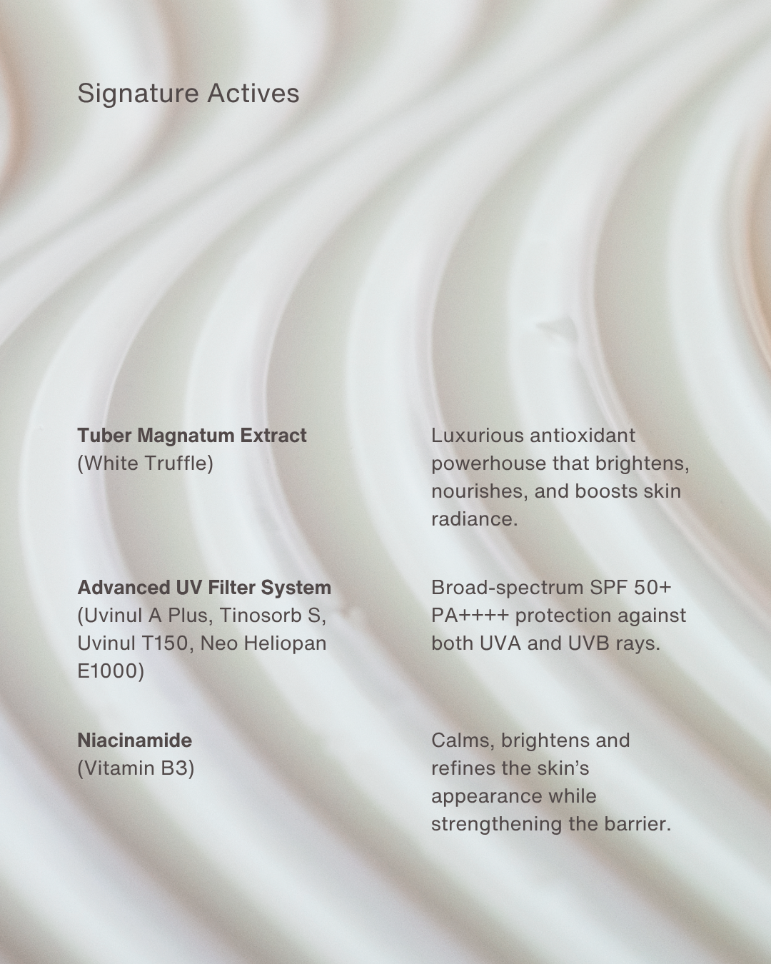 A luxurious antioxidant powerhouse, white truffle helps fight free radical damage caused by UV exposure and environmental stressors. It boosts skin vitality, promotes radiance, and contributes to long-term skin resilience and glow.